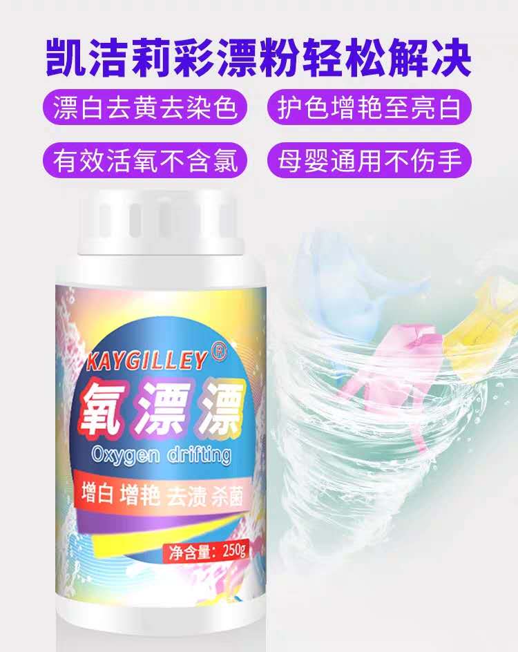 彩漂粉也叫氧漂粉是釋氧型漂白劑,溶于水后能生成過氧化氫,是氧漂的一種,它對織物的漂白較溫和,一般不會損傷織物,可令白色或有色織物漂白后色澤更亮麗。常用的含氧漂白劑主要是雙氧水和彩漂粉,有較好的漂白作用和殺菌作用。氧漂是通過在水溶液中經過過羥離子游離出活性氧而產生漂白作用,在常溫下,它的漂白速度比較緩慢,為了提高洗滌速率,一般在高溫條件下進行漂白,既提高了漂白速度,也增加了織物的的去污力和白度。