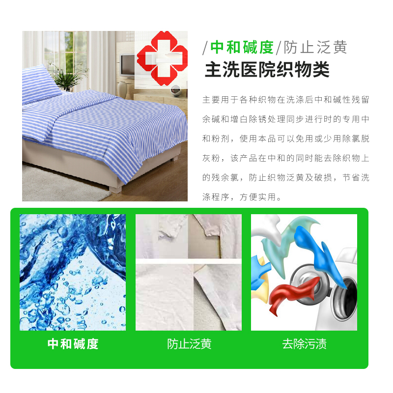 1、主要用于各種織物在洗滌后中和殘留余堿和增白除銹處理同步進行時的專用中和劑。